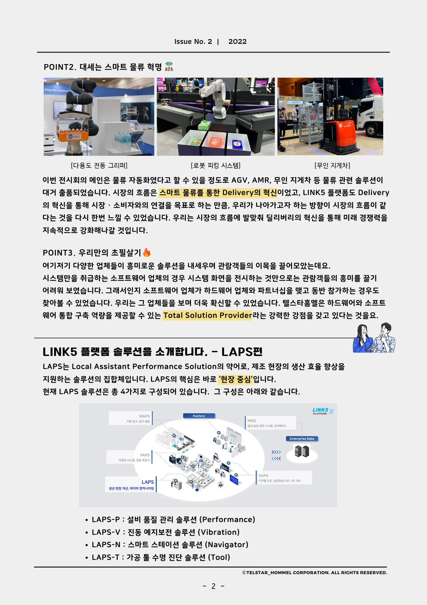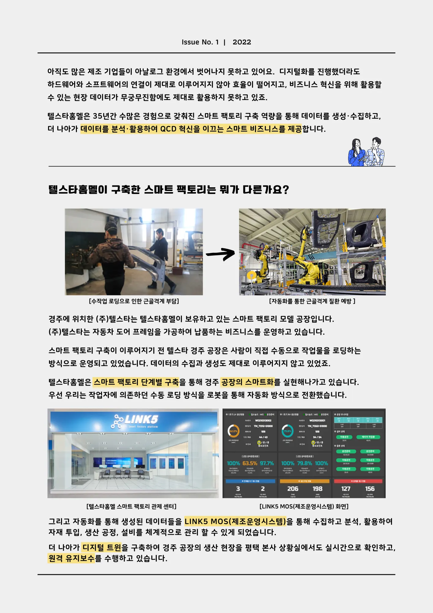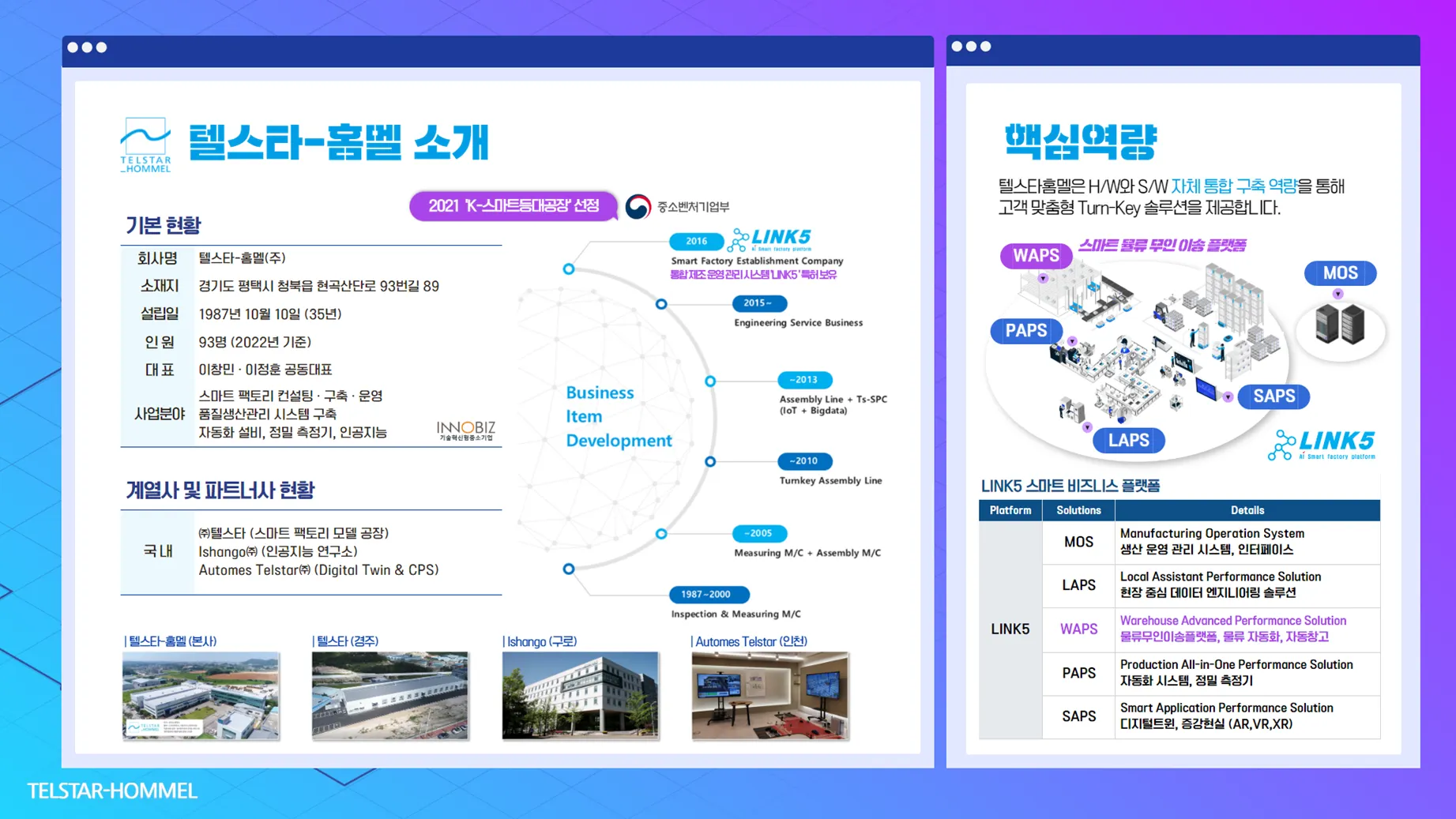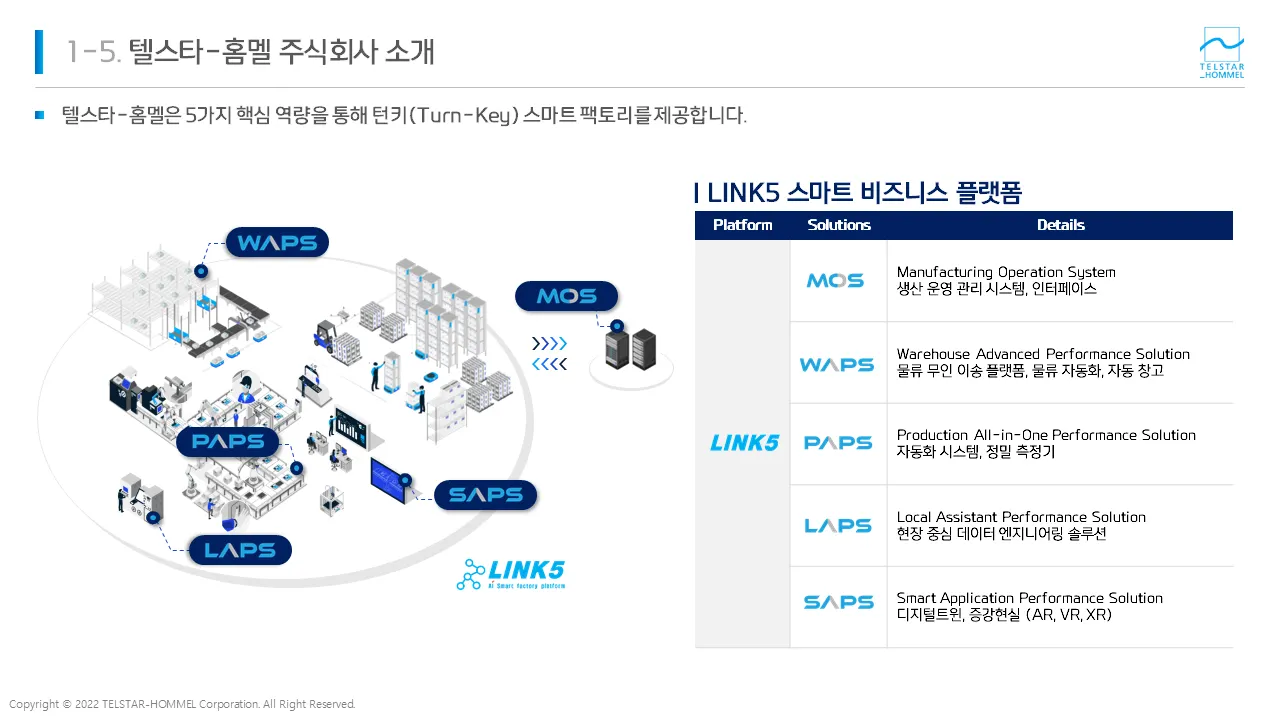 LINK5는 텔스타의 37년간 다양한 산업에서 축적된 생산 라인(H/W) 구축 경험과 생산 실행 시스템(S/W) 구축 노하우에 기반한 인공지능 Smart Factory Platform입니다.